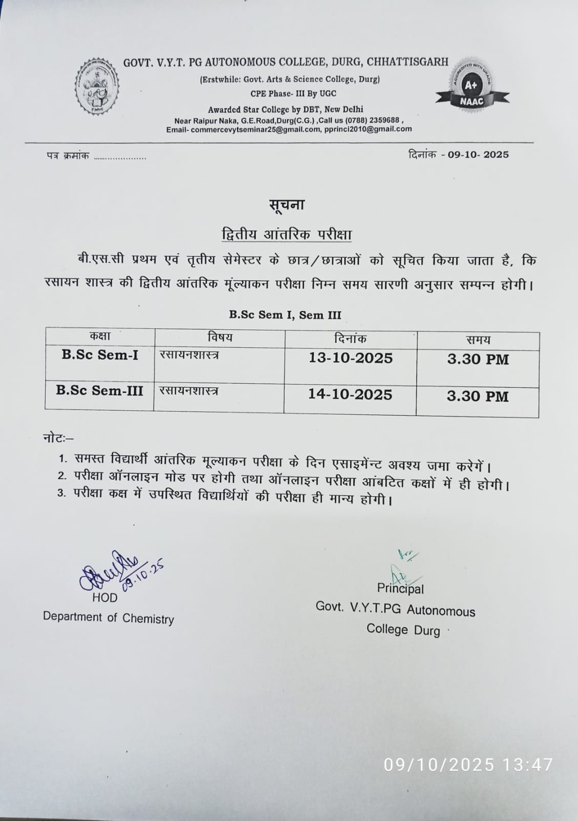द्वितीय आंतरिक मूल्याकन परीक्षा रसायनशास्त्र विभाग टाइम टेबल
